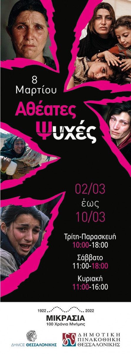 Η φετινή έκθεση της Δημοτικής Πινακοθήκης Θεσσαλονίκης για την Παγκόσμια Ημέρα της Γυναίκας με τίτλο «Αθέατες Ψυχές» είναι αφιερωμένη στις γυναίκες πρόσφυγες, που αναγκάστηκαν να εγκαταλείψουν τις πατρίδες τους, να υποστούν κακουχίες, να εκτεθούν σε κινδύνους, εκμετάλλευση, βία και διακρίσεις. Στις γυναίκες αυτές, που τελικά κατάφεραν να ορθώσουν το ανάστημά τους, να ξαναχτίσουν τη ζωή τους και να μας δίνουν έμπνευση και δύναμη κάθε μέρα.