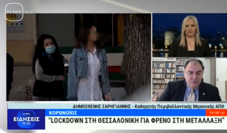 O καθηγητής Περιβαλλοντικής Μηχανικής του ΑΠΘ Δημοσθένης Σαρηγιάννης μίλησε στο κεντρικό δελτίο ειδήσεων της Δημοτικής Τηλεόρασης Θεσσαλονίκης TV100 και στη Βίκυ Δήμου, εκτιμώντας την κατάσταση που επικρατεί αυτή τη στιγμή με τα μέτρα lockdown στη Θεσσαλονίκη.