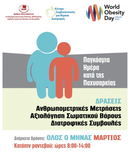 Με αφορμή την Παγκόσμια Ημέρα κατά της Παχυσαρκίας που έχει οριστεί η 4η Μαρτίου , η Αντιδημαρχία Κοινωνικής Πολιτικής, Αλληλεγγύης, Δημόσιας Υγείας και Ισότητας των Δύο Φύλων διοργανώνει δράση ενημέρωσης και πρόληψης με ΔΩΡΕΑΝ ανθρωπομετρικές μετρήσεις, αξιολόγηση σωματικού Βάρους και διατροφικές συμβουλές για τον μήνα Μάρτιο. Σκοπός της δράσης είναι η πρόληψη και έγκαιρη αντιμετώπιση της Παχυσαρκίας. Η δράση απευθύνεται σε κάτοικους του Δήμου Καλαμαριάς, οι οποίοι θα έχουν τη δυνατότητα να υποβληθούν σε ανθρωπομετρικές μετρήσεις και να λάβουν διατροφικές συμβουλές μόνο κατόπιν ραντεβού. Οι ενδιαφερόμενοι μπορούν να απευθύνονται στο Κέντρο Συμβουλευτικής για θέματα Διατροφής του Δήμου Καλαμαριάς προκειμένου να κλείσουν το ραντεβού τους. Τηλέφωνο Επικοινωνίας: 2313.314.524