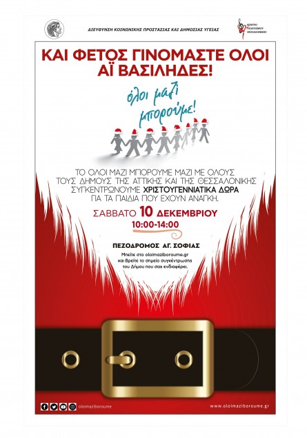 Η Διεύθυνση Κοινωνικής Προστασίας και Δημόσιας Υγείας και το Κέντρο Πολιτισμού του Δήμου Θεσσαλονίκης στο πλαίσιο των κοινωνικών δράσεων και ενόψει των εορτών των Χριστουγέννων, σε συνεργασία με το «ΟΛΟΙ ΜΑΖΙ ΜΠΟΡΟΥΜΕ», διοργανώνουν δράση συγκέντρωσης παιχνιδιών, παιδικών βιβλίων, σχολικών ειδών, για να προσφέρουν τη χαρά σε παιδιά του Δήμου που το έχουν ανάγκη και κανένα παιδί να μη μείνει χωρίς το δώρο του.