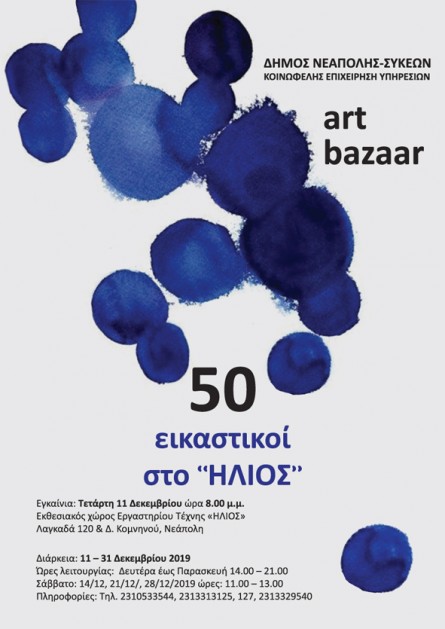 Η έκθεση εικαστικών έργων ART BAZAAR, είναι μια αδιαμεσολάβητη ομαδική έκθεση που φέρνει σε επαφή τους Έλληνες και ξένους εικαστικούς που ζουν και δημιουργούν στην πόλη μας, αλλά και έξω απ’ αυτήν, με το κοινό που αγαπάει την Τέχνη. Η Έκθεση, που διοργανώνει ο δήμος Νεάπολης-Συκεών και η Κοινωφελής Επιχείρηση Υπηρεσιών (ΚΕΥΝΣ), ξεκινά σήμερα Τετάρτη 11 Δεκεμβρίου 2019, με τα εγκαίνια να πραγματοποιούνται στις 8 μ.μ.. Θα φιλοξενηθεί στο Εικαστικό Κέντρο «ΗΛΙΟΣ» (Λαγκαδά 120 & Δ. Κομνηνού, Νεάπολη) έως και την Τρίτη 31 Δεκεμβρίου 2019. Οι φίλοι της Τέχνης μπορούν να θαυμάσουν τα έργα 50 και πλέον εικαστικών καλλιτεχνών, αλλά και να τα αποκτήσουν σε χαμηλές τιμές. Η πρόταση συνδυάζει την προβολή του καλλιτεχνικού έργου με την εικαστική ενημέρωση, την επικοινωνία του θεατή-«αναγνώστη», την αναγνώριση, αξιολόγηση και ανακάλυψη του «σημαντικού» μέσα από τη συγκριτική λειτουργία της καλλιτεχνικής έκφρασης, ενώ δίνει τη δυνατότητα απόκτησης ενός σημαντικού έργου Τέχνης σε χαμηλό κόστος, κάνοντας ένα σπουδαίο δώρο στον εαυτό τους ή στο οικείο περιβάλλον τους.