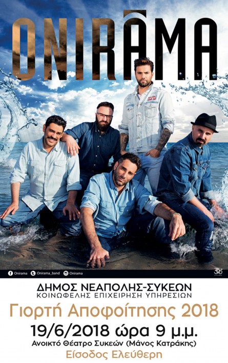 Γιορτή αποφοίτησης με αφορμή το τέλος της σχολικής χρονιάς διοργανώνει ο δήμος Νεάπολης-Συκεών. Πρόκειται για συναυλία των ΟΝΙΡΑΜΑ η οποία θα δοθεί αύριο, Τρίτη 19 Ιουνίου 2018, στις 9 μ.μ., στο Ανοιχτό Θέατρο Συκεών «Μάνος Κατράκης» (Καρόλου Κουν 13, Συκιές), με ελεύθερη είσοδο.