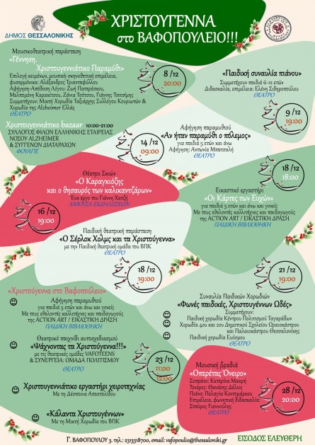 Εκδήλωση με τίτλο «Χριστούγεννα στο Βαφοπούλειο» με αφήγηση παραμυθιού, στις 11:00, για παιδιά ηλικίας πέντε ετών και άνω, καθώς και γονείς, στην παιδική βιβλιοθήκη, με τη συμμετοχή καλλιτεχνών και παιδαγωγών της Action Art.