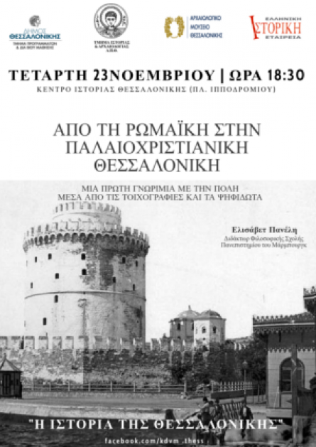 Στις 23 Νοεμβρίου 2022, ώρα 18:30 θα πραγματοποιηθεί στο Κέντρο Ιστορίας Θεσσαλονίκης (πλατεία Ιπποδρομίου) η δεύτερη διάλεξη με θέμα: “Από τη ρωμαϊκή στην παλαιοχριστιανική Θεσσαλονίκη. Μια πρώτη γνωριμία με την πόλη μέσα από τις τοιχογραφίες και τα ψηφιδωτά της.” Εισηγήτρια θα είναι η κυρία Ελισάβετ Πανέλη, Διδάκτωρ της Φιλοσοφικής Σχολής του Πανεπιστημίου του Μάρμπουργκ (με ειδίκευση στην Ιστορίας της Τέχνης και συγκεκριμένα στην παλαιοχριστιανική αρχαιολογία και βυζαντινή τέχνη).
