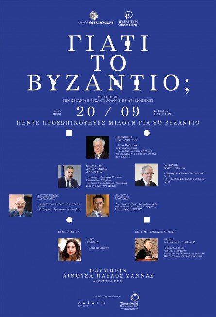 Ο Δήμος Θεσσαλονίκης σε συνεργασία με το Σωματείο «Βυζαντινή Οικουμένη» διοργανώνουν στη Θεσσαλονίκη εκδήλωση με τίτλο «Γιατί το Βυζάντιο;» την Τετάρτη 20 Σεπτεμβρίου 2023, στις 19.00 στην Αίθουσα «Παύλος Ζάννας» του κινηματογράφου Ολύμπιον (Αριστοτέλους 10).