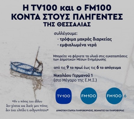 Αν ο πόνος του άλλου δεν γίνεται και δικός μου πόνος, δεν έχει ελπίδα η ανθρωπότητα». Η Δημοτική Τηλεόραση Θεσσαλονίκης TV100 και το Δημοτικό Ραδιόφωνο Θεσσαλονίκης FM100, στο πλευρό των πληγέντων κατοίκων της Θεσσαλίας. Παίρνουμε την πρωτοβουλία, ζητάμε τη βοήθειά σας και συλλέγουμε τρόφιμα μακράς διαρκείας και εμφιαλωμένα νερά. Μπορείτε να φέρνετε τα υλικά στις εγκαταστάσεις των Δημοτικών Μέσων Ενημέρωσης, Νικολάου Γερμανού 1, (στο Μέγαρο της Ε.Μ.Σ.) από τη Δευτέρα 11 Σεπτεμβρίου, από τις 9 το πρωί έως τις 6 το απόγευμα. Η TV100 και ο FM100 κοντά στους πληγέντες της Θεσσαλίας!