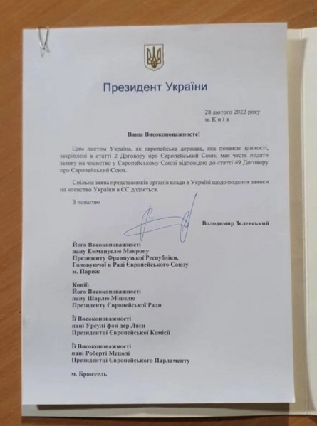 O Βολοντίμιρ Ζελένσκι υπέγραψε νωρίτερα σήμερα την αίτηση για ένταξη της Ουκρανίας στην Ευρωπαϊκή Ένωση. Ο Ουκρανός πρόεδρος Βολοντίμιρ Ζελένσκι είχε προβεί σε βιντεοσκοπημένο διάγγελμα στο οποίο απηύθυνε έκκληση στην Ευρωπαϊκή Ένωση για την επείγουσα ένταξη της χώρας στο μπλοκ των 27 μελών υπό ειδικές διαδικασίες. «Καλούμε την Ευρωπαϊκή Ένωση να ενταχθεί άμεσα η Ουκρανία με νέα ειδική διαδικασία. Είμαστε ευγνώμονες στους συνεργάτες μας που είναι μαζί μας. Στόχος μας όμως είναι να είμαστε μαζί με όλους τους Ευρωπαίους και, το πιο σημαντικό, να είμαστε ίσοι», είπε νωρίτερα σήμερα στο διάγγελμά του ο Ουκρανός πρόεδρος.