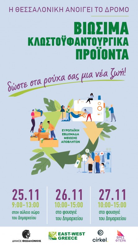 Ο Δήμος Θεσσαλονίκης δίνει ενεργά το «παρών» στην προσπάθεια του Εθνικού Οργανισμού Ανακύκλωσης σε συνεργασία με την East West Greece με ένα πλούσιο τριήμερο (25-27/11) δράσεων αφιερωμένων στα «Βιώσιμα Κλωστοϋφαντουργικά προϊόντα / Η Θεσσαλονίκη ανοίγει το δρόμο», στο χώρο του Δημαρχείου Θεσσαλονίκης.