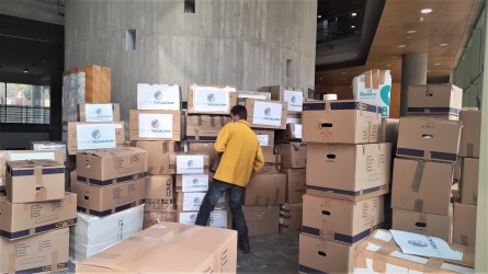 Δεκάδες εθελοντές -μέλη της ουκρανικής κοινότητας, φοιτητές αλλά και υπάλληλοι του Δήμου Θεσσαλονίκης- κατηγοριοποιούν τα είδη που συγκεντρώνονται, ώστε να διευκολύνεται η διαδικασία διαχείρισης της ανθρωπιστικής βοήθειας.