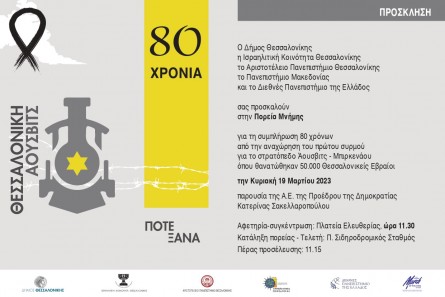 Παρουσία της Προέδρου της Δημοκρατίας Κατερίνας Σακελλαροπούλου πραγματοποιείται την προσεχή Κυριακή 19 Μαρτίου η σιωπηλή πορεία μνήμης για τα θύματα του Ολοκαυτώματος υπό τον τίτλο «Ποτέ ξανά, Θεσσαλονίκη-Άουσβιτς – 80 χρόνια από την αναχώρηση του πρώτου συρμού».