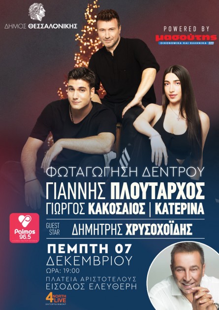 Αυτό το εορταστικό κλίμα θα πλαισιώσει ο δημοφιλής τραγουδιστής Γιάννης Πλούταρχος με μια μοναδική συναυλία, στην οποία θα ερμηνεύσει όλες τις μεγάλες επιτυχίες του. Θα βρεθεί στη σκηνή παρέα με τα παιδιά του Γιώργο Κακοσαίο και Κατερίνα Κακοσαίου, ενώ θα κάνει guest εμφάνιση o Δημήτρης Χρυσοχοΐδης.