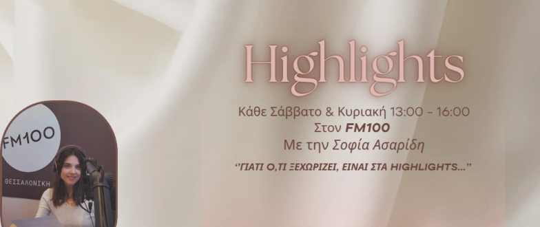 «Highlights» εκεί όπου η ενημέρωση, συναντά την ψυχαγωγία! Κάθε Σάββατο και Κυριακή, 13:00 με 16:00, η δημοσιογράφος Σοφία Ασαρίδη παίρνει τη σκυτάλη και μέσα από μία εύθυμη ματιά, μας παρουσιάζει όλα όσα ξεχώρισαν το Σαββατοκύριακο – αλλά και όσα θα μας απασχολήσουν την εβδομάδα που ακολουθεί. «Γιατί ό,τι ξεχωρίζει... Είναι στα Highlights!»
